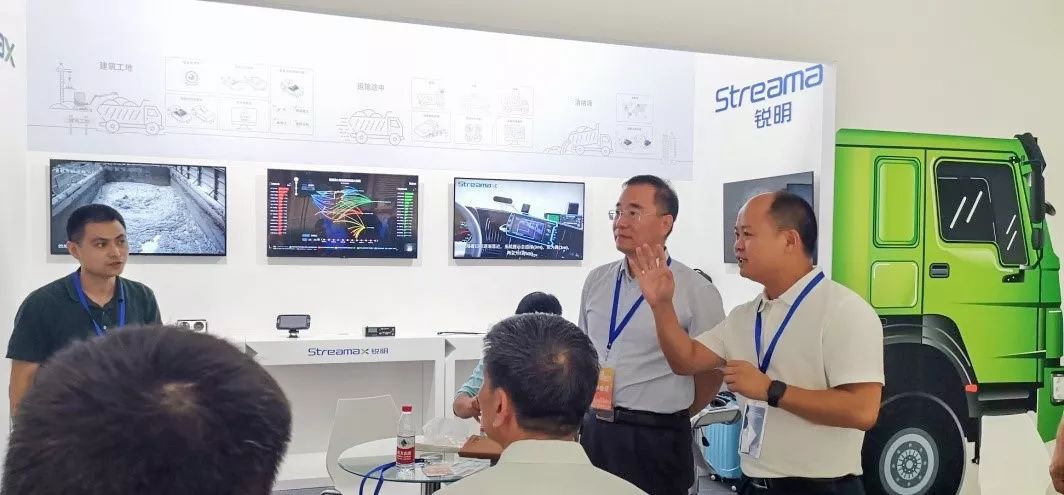 2019建筑垃圾與城市發展大會期間,銳明技術渣土產品線總經理方昌鑾(右1)向嘉賓介紹公司在建筑垃圾運輸領域的全新解決方案